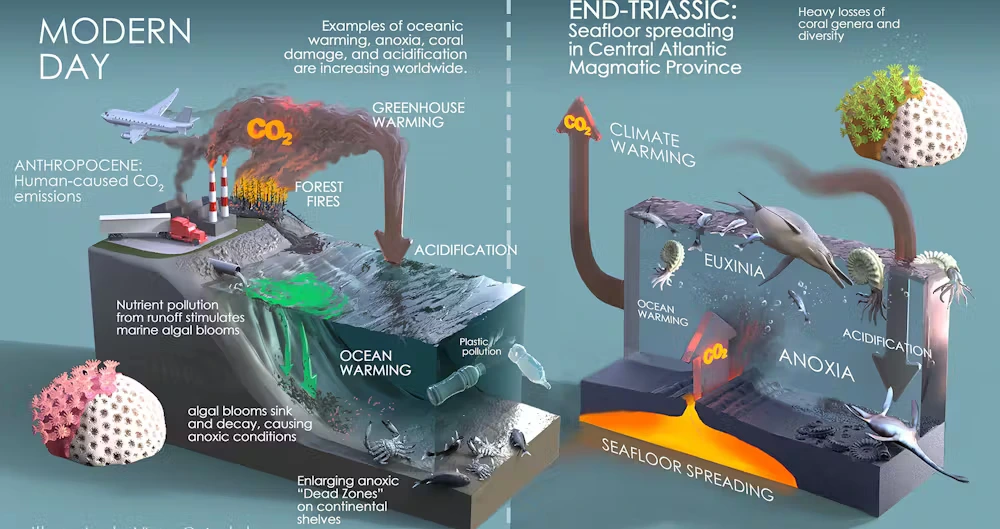 Schematic diagram showing the factors driving global ecological change in the modern day and at the end of the Triassic period. Victor Lesh