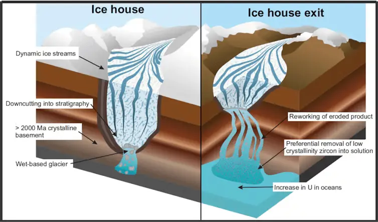 In new research published in Geology, we show that these crushing rivers of ice, sometimes kilometres deep, pulverised the planet’s rocky surface like enormous bulldozers. When the ice eventually thawed, the ground-up minerals washed into the oceans where they may have provided the nutrients needed for the evolution of complex life.